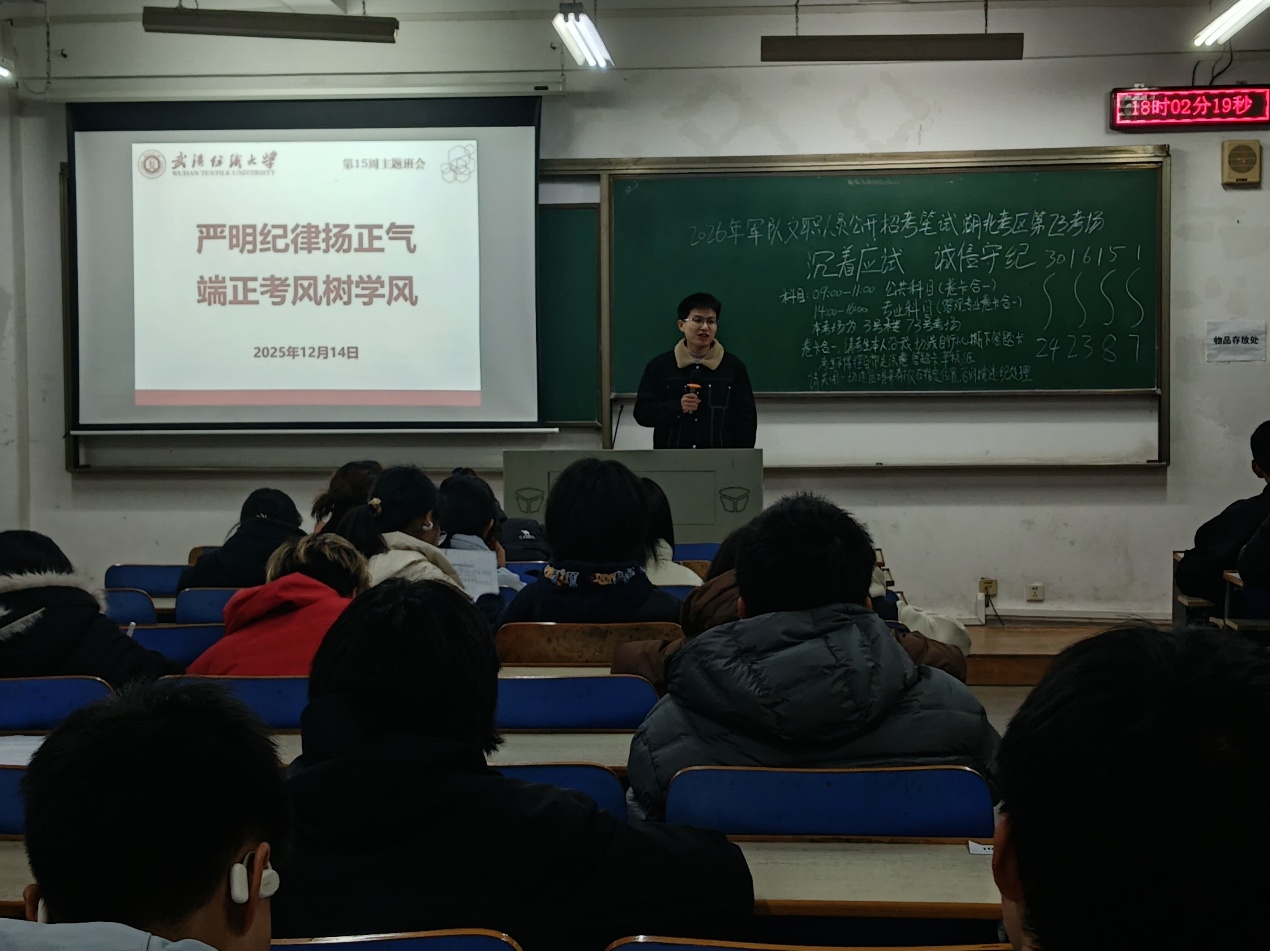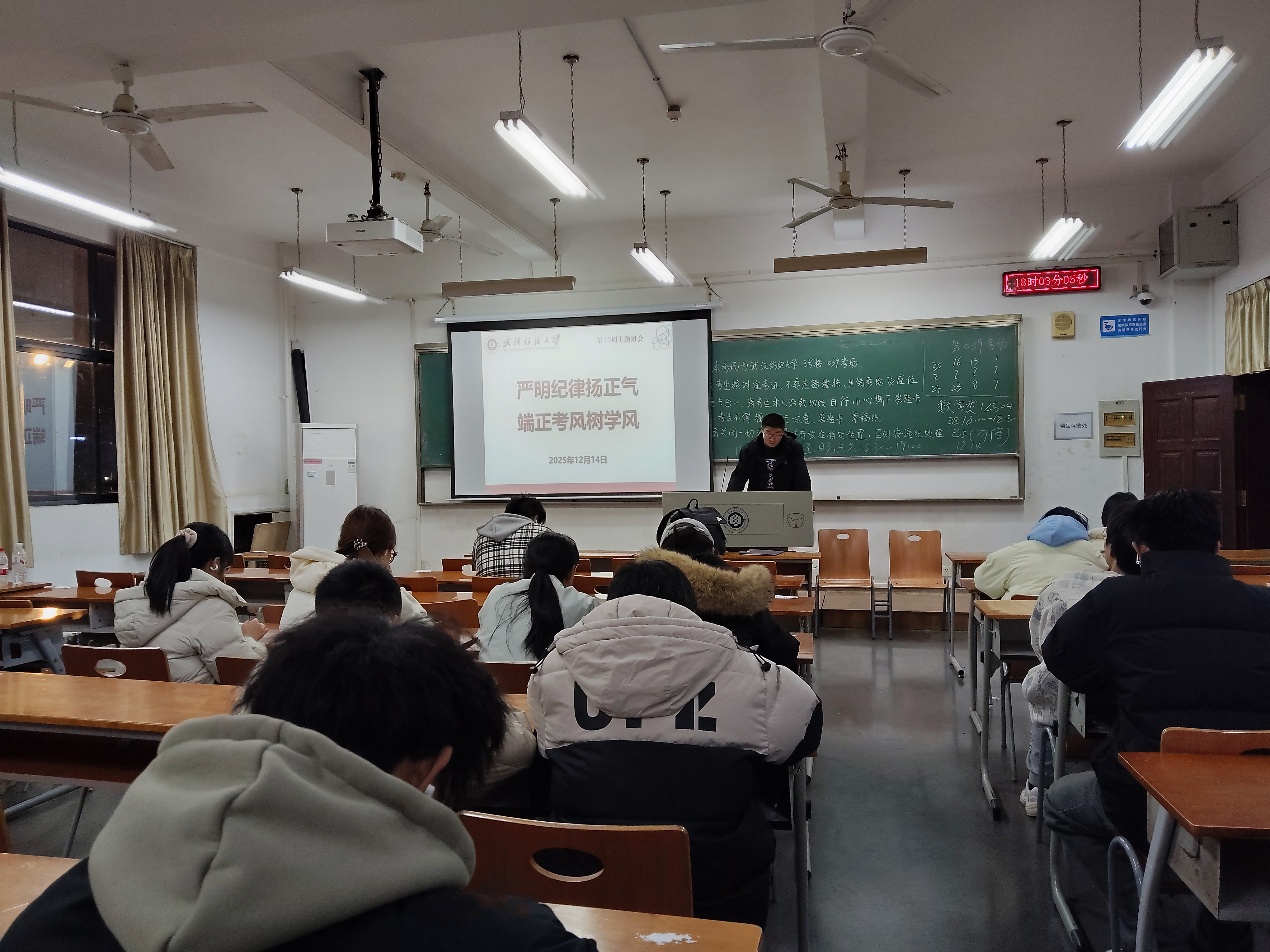 为强化学生诚信应考意识,筑牢学风建设根基,12月14日,WilliamHill体育组织各班级开展第十五周“诺守诚信考风 践行守信之德”主题班会,为即将到来的期末考试保驾护航。WilliamHill体育全体同学参加,班会由各班班长主持。