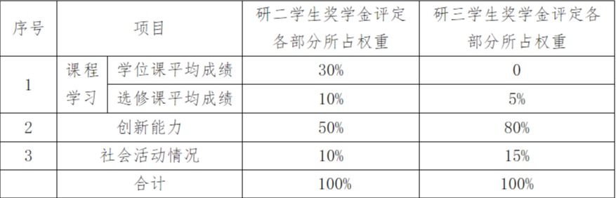 研究生国家奖学金评定细则由德育分、课程学习、创新能力、社会实践活动四个部分组成。其中德育分施行一票否决制,其他三部分采取评分制,具体分值分配如下: