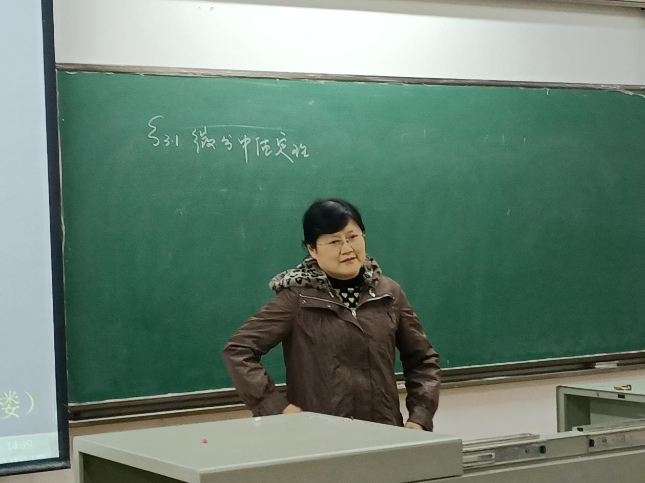 王丽老师的公开课题目为“中值定理”。王老师在公开课中,展示了良好的教学教态,优秀的粉笔字板书等,显示出出众的教学基本功。并于报告后交流课程内容处理技巧、个人体会和教学心得。
