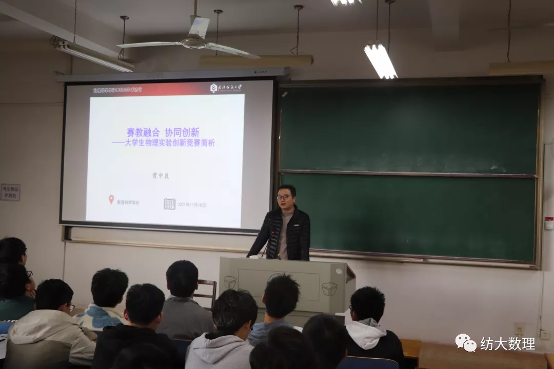 会议伊始,时亚洲老师为在场同学主讲了《数学建模-让数学走近生活》,并鼓励学生积极参加数学建模大赛。他与同学们交流了“为什么学数学”,“数学到底有没有用”,“数学建模给我们带来什么”等问题,他希望同学们能加强自主学习能力,丰富实践知识。随后,曾中良老师向同学们介绍《大学生物理实验竞赛简析》,他以“赛教融合,协同创新”为中心,简要的介绍了大学生物理实验竞赛的办赛背景、办赛目的、组织机构、比赛类别、参赛资格及赛程设置等,并展示部分典型案例。他希望,同学们要有远大的科学理想,正确的世界观、方法论以及团队合作意识,方能成人成才,创新创造。
