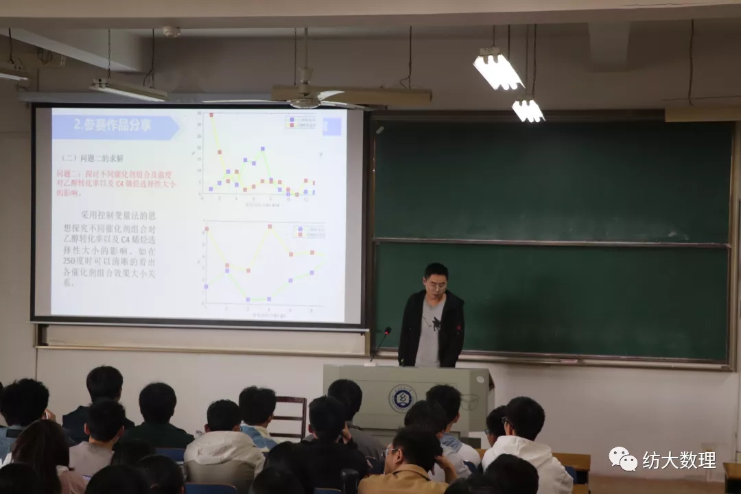 在此之后,学生代表马清奎分享了自己的数学建模心得体会和作品。他向同学们分享宝贵的参赛经验 ,并建议同学们做好基础知识准备,找好队友,及时总结经验。学生代表张驰以分享课题《知微见著——创新源于细节》的方式,介绍了参赛的完整过程。他提出竞赛可以提高表达能力,考验临场反应,锻炼心理素质,提升自我能力,开拓眼界,也会成为考研就业的加分项。学生代表李瑾以幽默的方式给同学们分享课题《色彩的秘密-虹与霓的设计与再现》,她向大家描述了在研究过程中遇到的难题,以及一波三折的参赛经历和丰富的收获。她告诉同学们要同优秀的人前行,从优秀的力量中汲取自己的力量,道阻且长,行且将至。