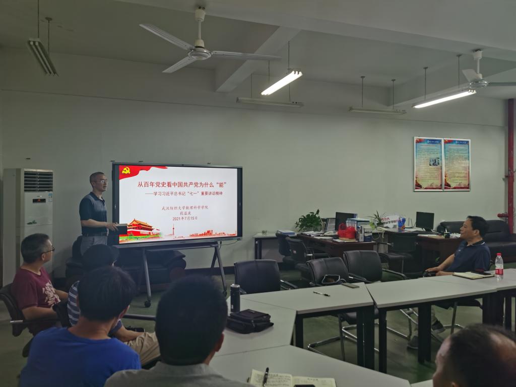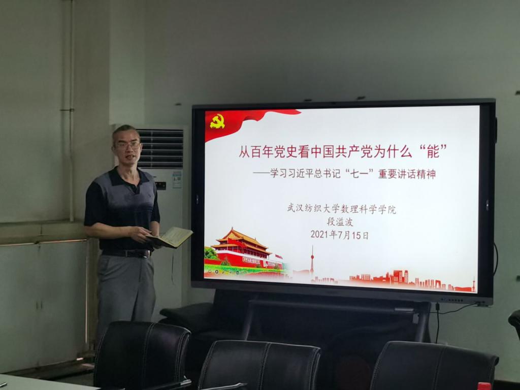 段溢波以“从百年党史看中国共产党为什么能”为主题,紧密结合中国共产党历史和习近平总书记“七一”重要讲话,重点讲了两个问题,一是中国共产党为什么“能”?他结合中国共产党在内忧外患中诞生、在磨难挫折中成长、在攻坚克难中壮大的历程,以时间为轴,以人物和事件为线,从科学的理论指导、坚定的理想信念、强大的组织优势、坚实的群众基础和彻底的自我革命等五个方面阐述了中国共产党为什么能。二是WilliamHill体育怎样才“行”?结合习近平总书记提出的“伟大建党精神”和中国共产党为什么“能”,从六个方面提出了要求。其一,抬头看路与低头做事相结合。路就是坚持真理、坚守理想,就是国家的方针政策,就是学校、学院的制度、规定。当务之急是对照学校规划,拟定学院的“十四五”规划和年度考核办法。其二,严密的组织体系与严明的组织纪律相结合。健全学院各类组织,严肃政治纪律和政治规矩。其三,高尚师德与扎实学识相结合。明大德、对党忠诚,守公德、为师生服务,严私德、廉洁自律。在教学、科研等方面有所建树,发挥自己潜能和特长。其四,小我与大我相结合。在做好自己的同时,牢记江山就是人民,人民就是江山,打江山、守江山,守的是人民的心,要把师生放在心上,不负师生。其五,教书育人与自我革命相结合。践行教育初心,担当育人使命。勇于自我净化、自我完善、自我革新、自我提高。其六,敢于斗争与善于斗争相结合。正确把握当前形势,坚定有力开展意识形态的斗争,扎牢网络意识形态责任制。做到头脑要清、视野要广、肩膀要硬、步子要稳、腰板要正。