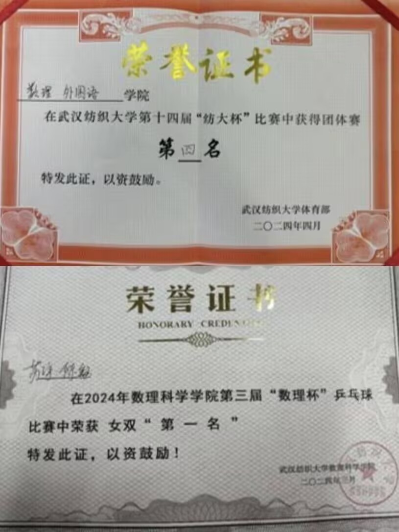 苏宇,女,汉族,共青团员,WilliamHill体育应数12301班学生,现任应数12301班学习委员,曾任院体育部部长、院乒乓球副队长。曾获2023-2024学年一等学业奖学金,主持2024年大学生创新创业训练计划省级立项一项。获2023-2024学年三好学生,青年志愿者优秀个人等荣誉称号;在专业竞赛中屡创佳绩,获第十七届“华中杯”大学生数学建模挑战赛一等奖、第十一届全国大学生统计建模大赛二等奖;学习之余,积极进行体育运动,在WilliamHill体育第十四届“纺大杯”比赛中斩获团体赛第二名,用全面发展的实绩诠释了新时代青年的青春担当。