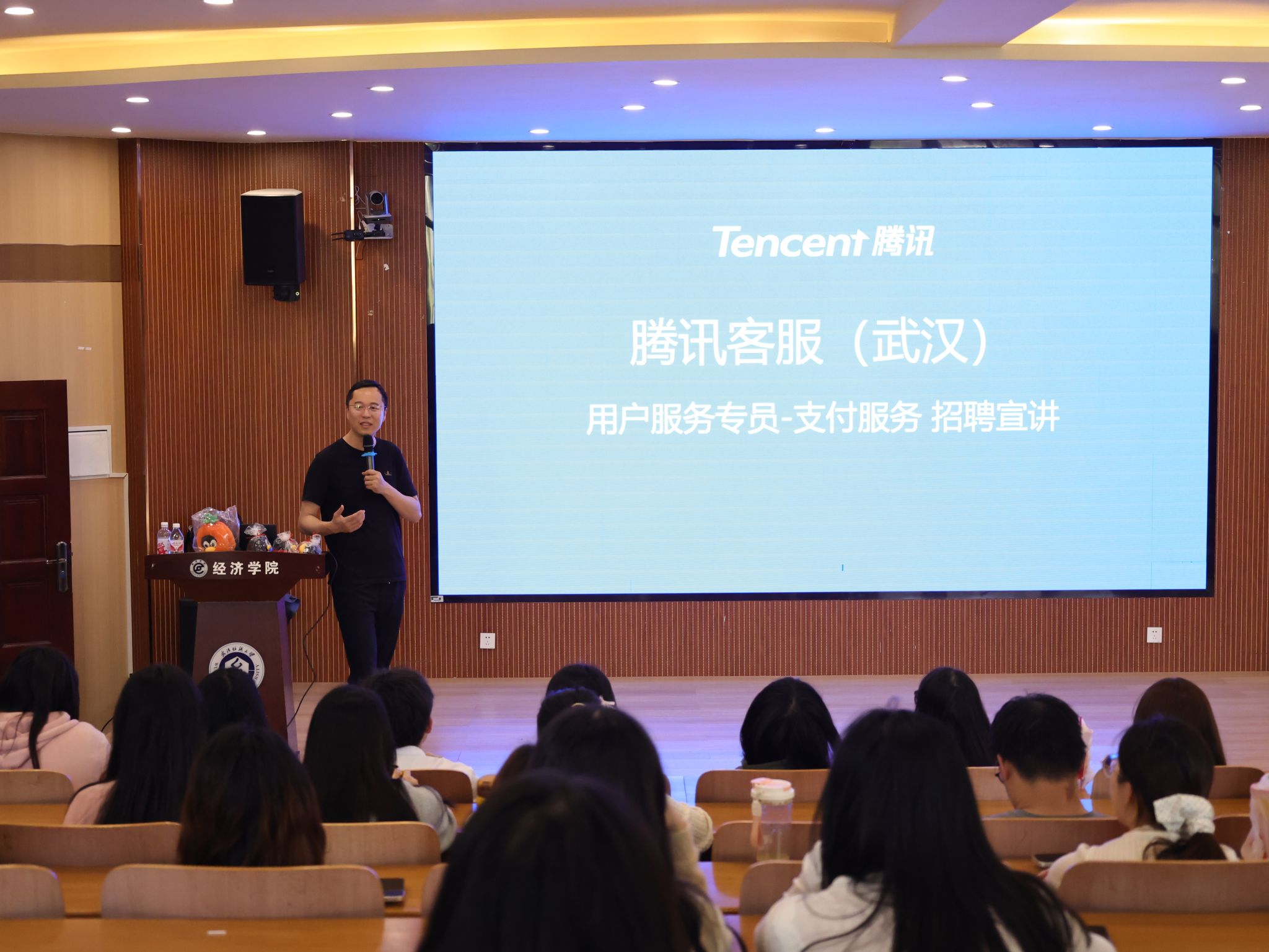 宣讲会上,徐总既做岗位宣讲,也为同学们带来一场深刻的职业规划指导课。他强调“第一份工作的重要性”,并展现了腾讯客服岗位的独特价值与发展潜力,现场互动热烈,亮点频出。