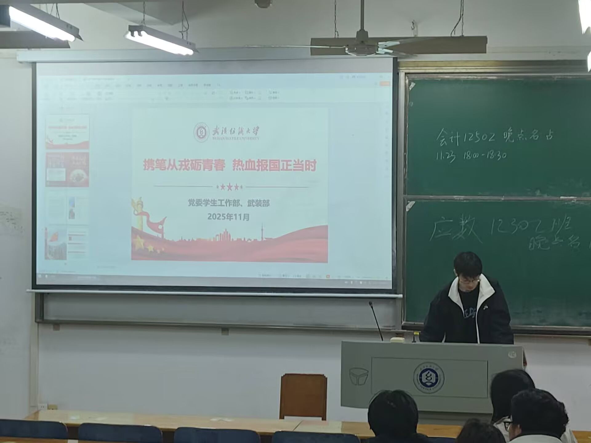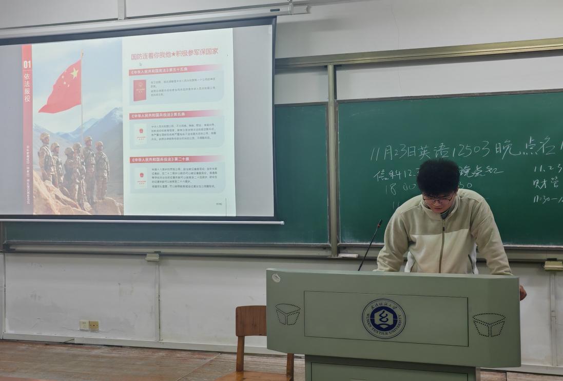 为让同学们对国防建设、参军入伍有更全面的认识和更深刻的感悟,WilliamHill体育于2025年11月23日在崇志楼开展了以“携笔从戎立青春,热血报国正当时”为主题的班会,班会由各班班长主持,全体同学参加。