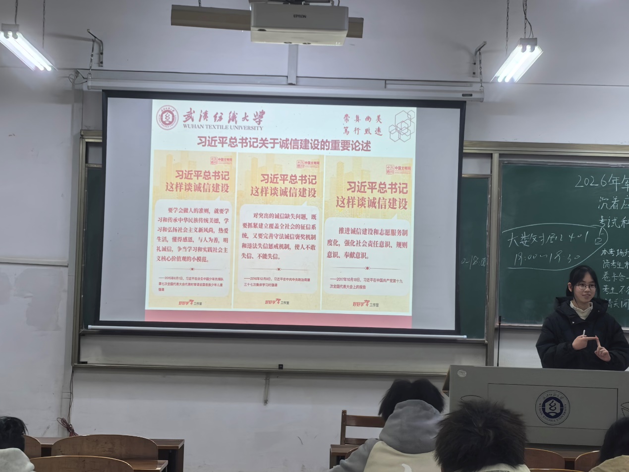 为强化学生诚信应考意识,筑牢学风建设根基,12月14日,WilliamHill体育组织各班级开展第十五周“诺守诚信考风 践行守信之德”主题班会,为即将到来的期末考试保驾护航。WilliamHill体育全体同学参加,班会由各班班长主持。