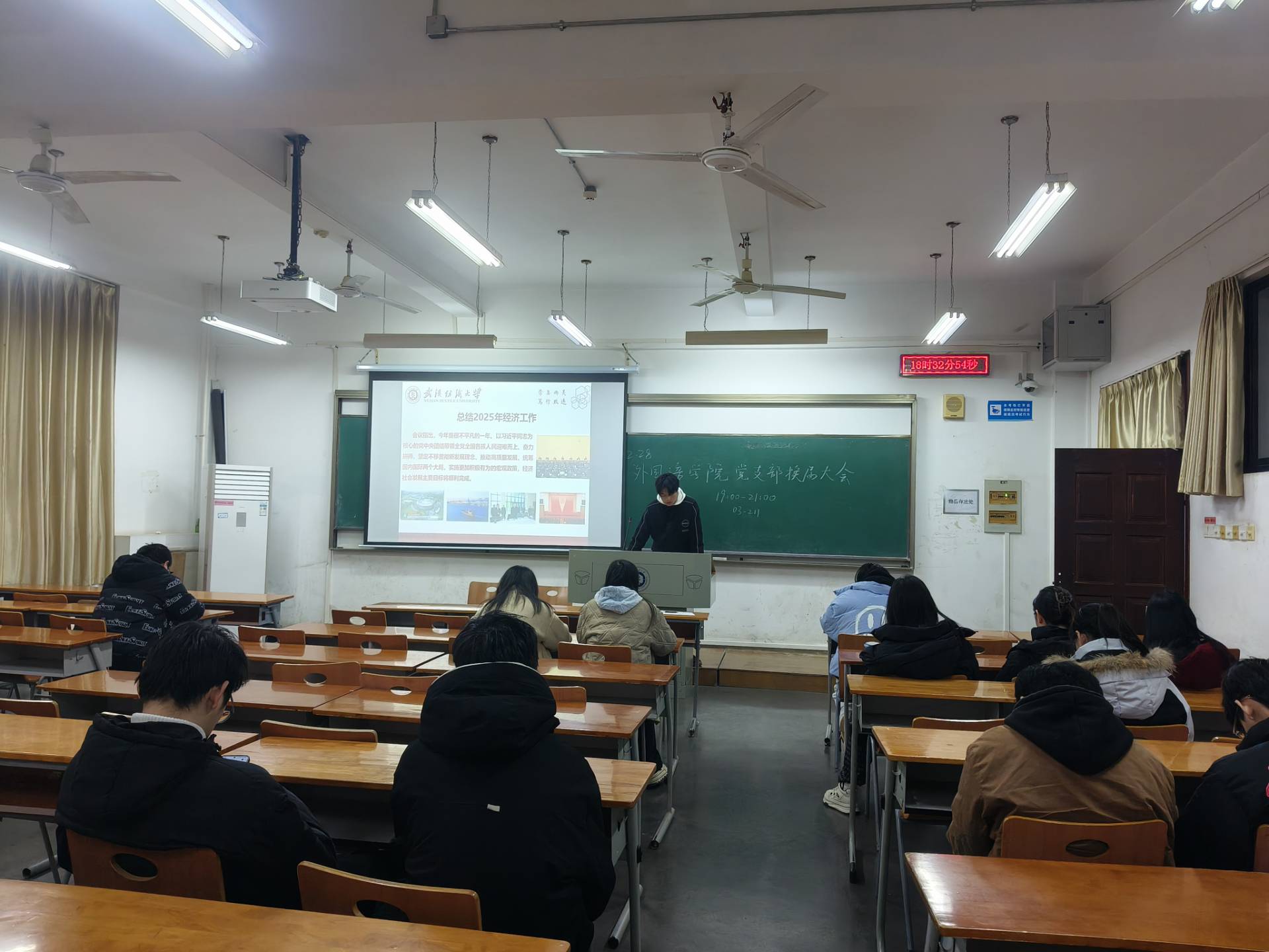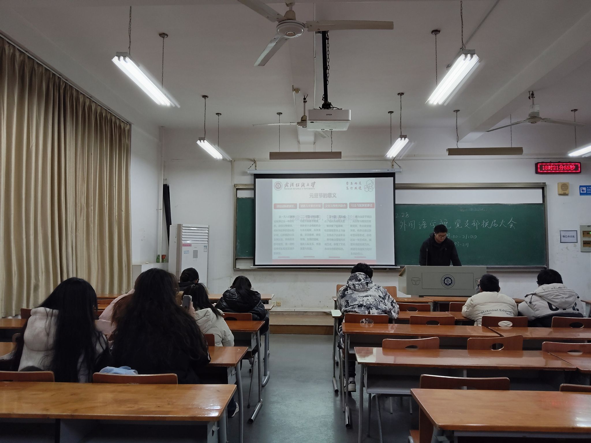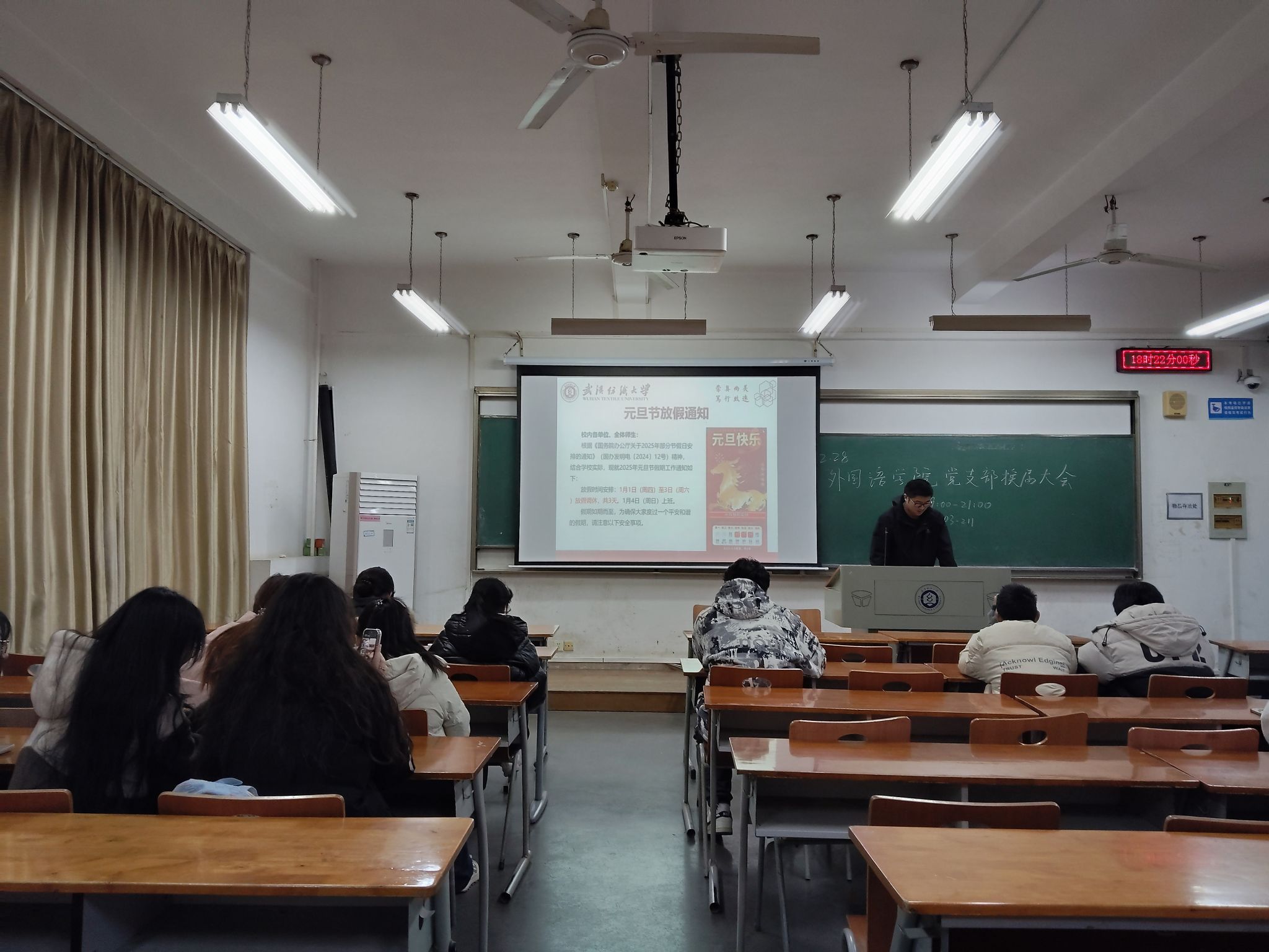 各班班长通过PPT展示元旦节放假通知的具体内容,明确了假期时间安排,并结合学院实际,对假期前后的教学衔接、学生离校返校管理提出要求。同时,针对元旦假期的交通安全、消防安全、人身财产安全等重点事项进行强调,提醒学生增强安全防范意识,合理规划假期行程。