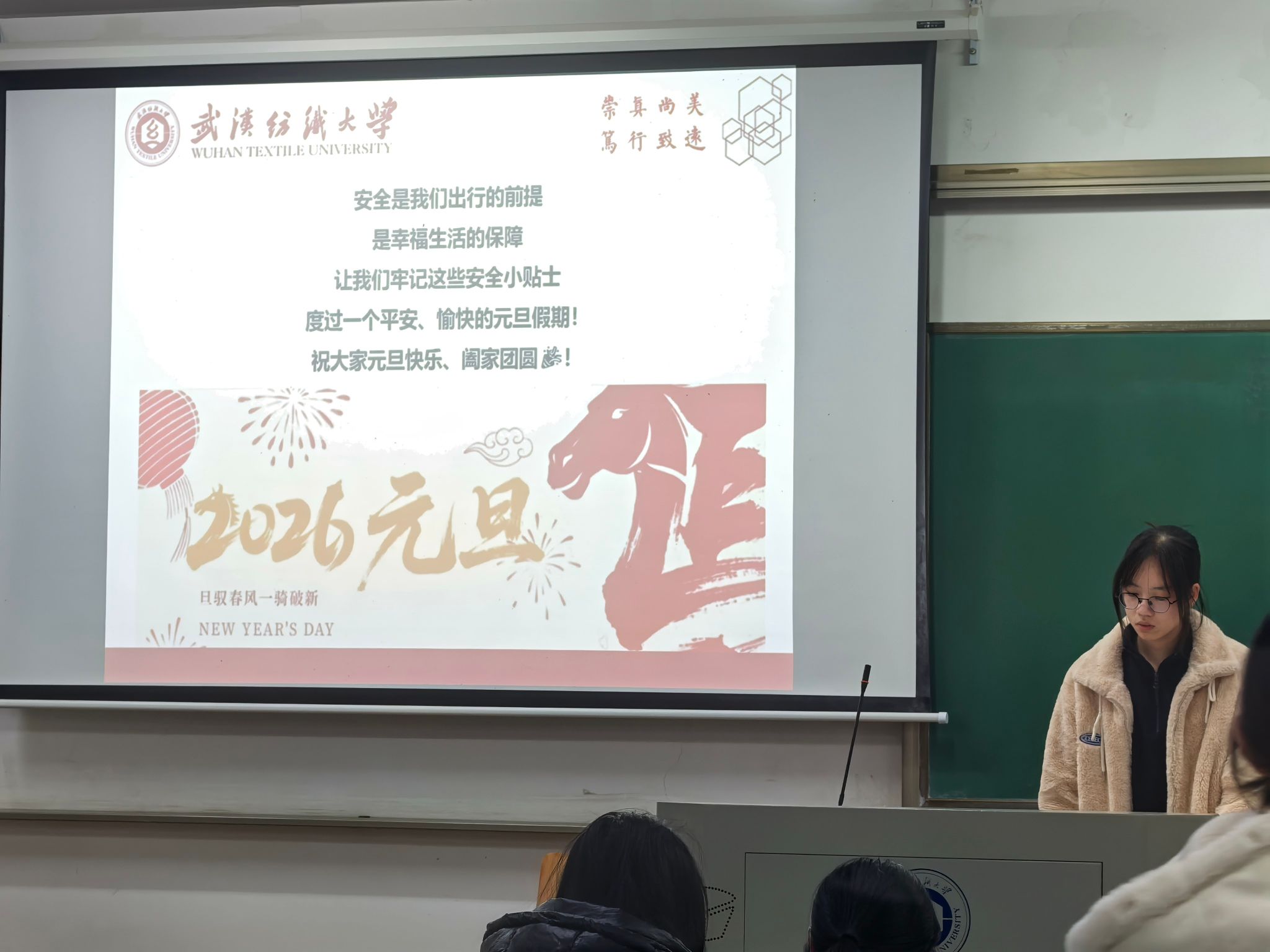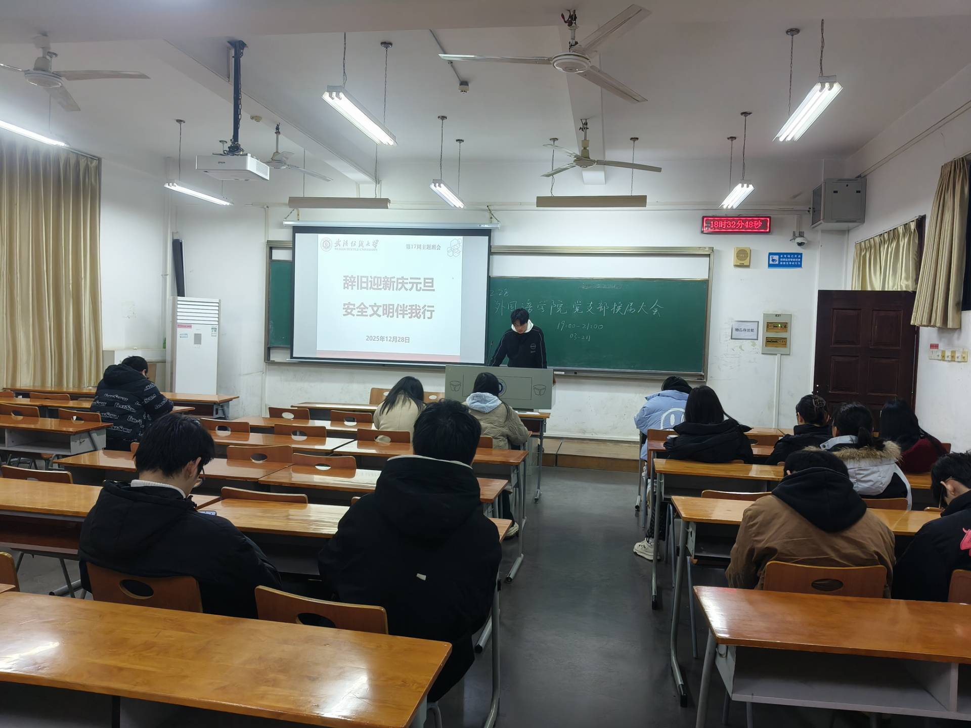 元旦的脚步悄然临近,安全文明的警钟时刻长鸣。12月28日,武汉纺织大学WilliamHill体育在崇志楼开展了一场以“辞旧迎新庆元旦,安全文明伴我行”为主题的班会活动。各班班长结合元旦假期特点,为同学们讲解假期安全注意事项与文明行为准则,同学们认真聆听讲解、积极参与互动讨论,在新年将至的氛围中,筑牢安全文明意识防线,为度过平安祥和的元旦假期打下坚实基础。