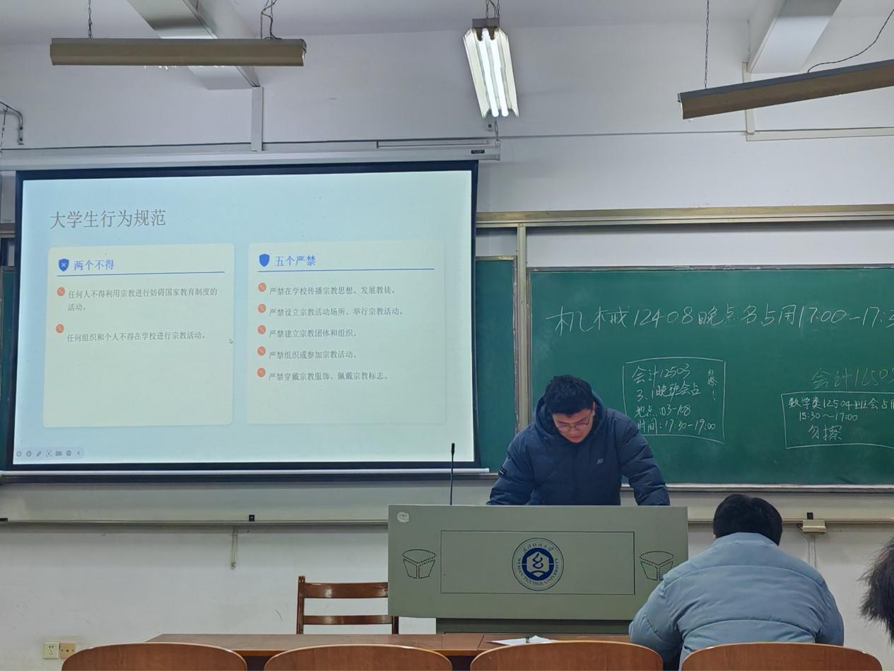 班会结合学院学生理性思维强的特点,通过案例分析与法理剖析相结合的方式,重点解读了《中华人民共和国教育法》第八条及《普通高等学校学生管理规定》中关于“教育与宗教相分离”的法律红线。 新学期伊始,WilliamHill体育坚持“严管”与“厚爱”并重。学院领导带队深入教学线,对第一周的课堂教学秩序进行了全面巡查。