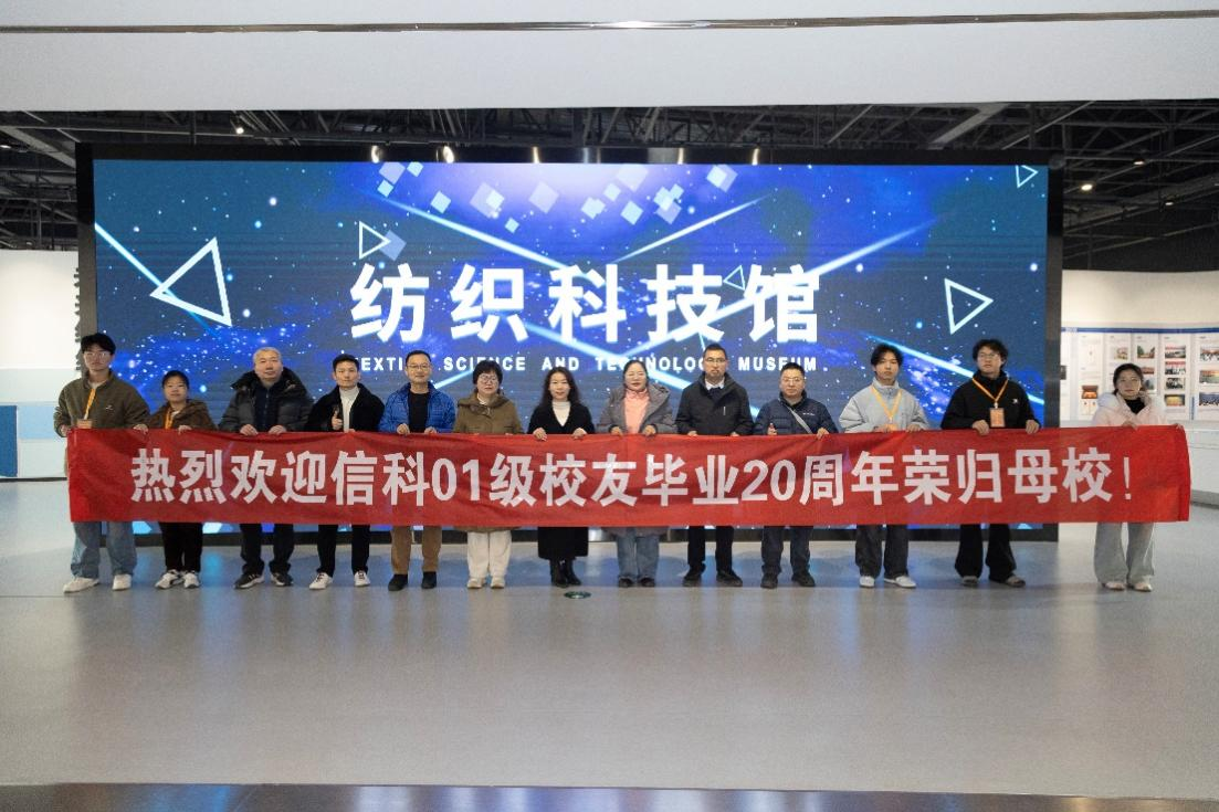 当日上午,校友们共同奔赴阳光校区,正式开启怀旧之旅。首先,校友们走进学校纺织科技馆,在展厅中近距离感受母校在纺织科技与创新领域的新成果,触摸校园发展的时代脉搏。在随后的“校园记忆行”步行导览中,校友们沿“建全大楼→二食堂→锦绣绿道→新体育馆→一食堂→四号教学楼”的青春路线漫步,熟悉的建筑与草木唤起了二十年前的求学回忆,沿途笑声与感慨交织。