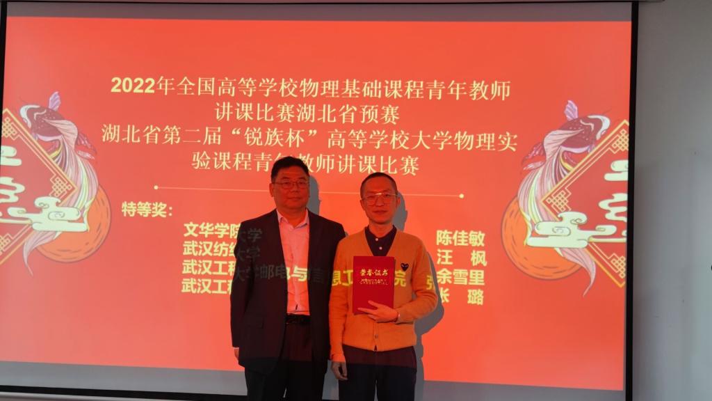 2022年5月22日,由湖北省物理学会、湖北省高等学校实验物理教学研究会、湖北省物理实验示范中心联席会、教育部高等学校大学物理基础课程教学指导委员会湖北省工作委员会主办,文华学院承办的2022年全国高等学校物理基础课程青年教师讲课比赛湖北赛区预赛正式拉开帷幕。本次比赛吸引了来自武汉大学、华中科技大学、华中师范大学、武汉理工大学等湖北省30所高校的青年才俊同场竞技,经过紧张激烈地角逐,我校WilliamHill体育的汪枫老师成功脱颖而出,荣获特等奖,将代表湖北省优秀青年教师参加中南地区复赛!