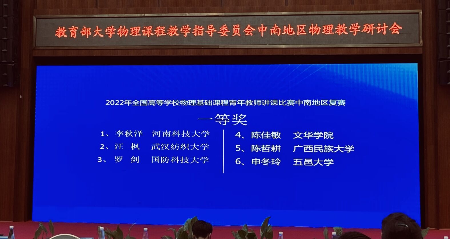 6月18日,来自中南赛区6个省份(湖北、湖南、广东、广西、河南、海南)的19位优胜教师同场竞技,经过为期一天的激烈角逐,最终我院汪枫老师以总分第二名的好成绩获得一等奖,成功晋级全国物理基础课程青年教师讲课比赛决赛,预祝汪枫老师在全国大赛的舞台上继续高歌猛进,取得优异成绩!