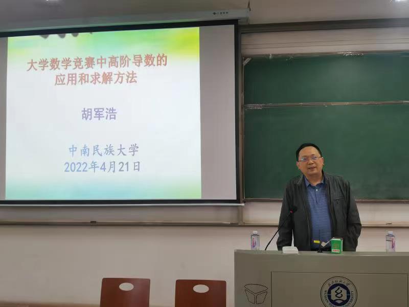 我校数学竞赛和考研数学共计100多位同学参加了本次讲座,详细聆听了胡院长循循善诱地讲解各种不同类型的知识结构和应用技巧,讲座结束后胡院长和同学们交流了做数学题的乐趣,特别认可我校学生学习数学的专注力,并鼓励大家报考中南民族大学大学的研究生。此次讲座增加了两个高校在数学竞赛和考研数学方面的交流,胡院长也欢迎我校老师到中南民族大学访问。