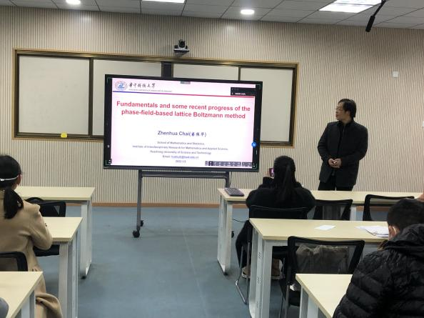 会上,柴振华教授作了题目为《Fundamentals and some recent progress of the phase-field-based lattice Boltzmann method》的学术报告,柴教授从研究背景、相场基础理论、相场格子Boltzmann方法的一些基础理论以及该方法在实际问题的应用方面做了较为详细的报告。报告内容丰富多彩,学院教师就建模理论、数学与工程应用的结合等方面与柴教授进行了深入交流,参会教师受益匪浅。