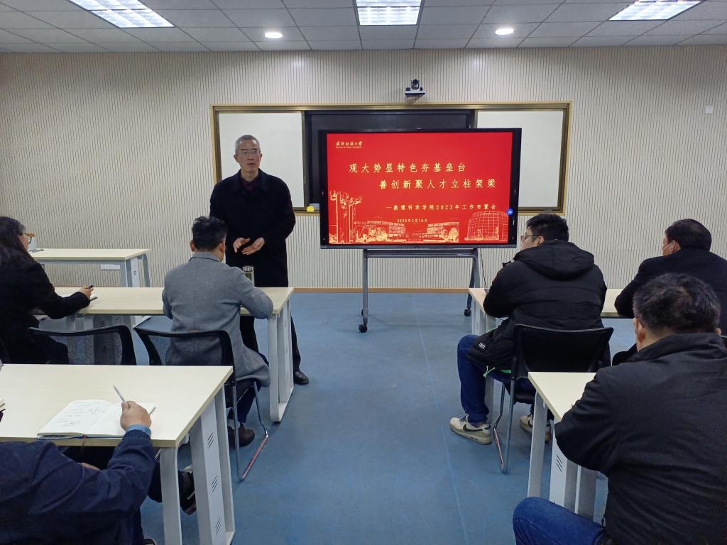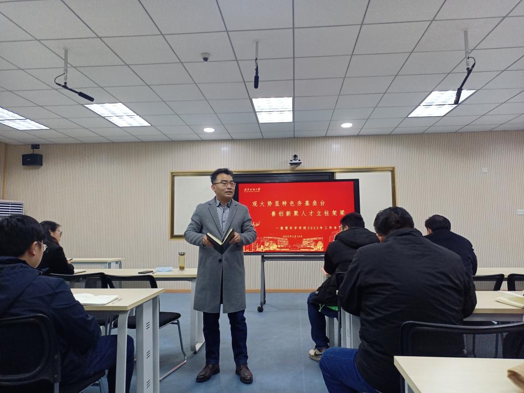 院长汪胜祥围绕湖北省为什么要大力推进一流学科建设、学校为什么要推行学部制、各学院如何与纺织学科实现交叉、未来学校在学院和学术方面的顶层设计、2023年学校的最大任务和当前学校发展中面临的最大压力等6个问题,传达了学校会议精神,田辉玉书记、徐卫林校长的讲话指示精神和2023年学校11件重点工作。布置了2023年学院学科建设、研究生培养、人才引育、制度建设等重点工作。