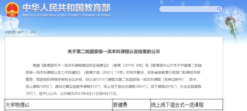 (郭健勇老师主持的《大学物理AI》获批国家级一流本科课程)