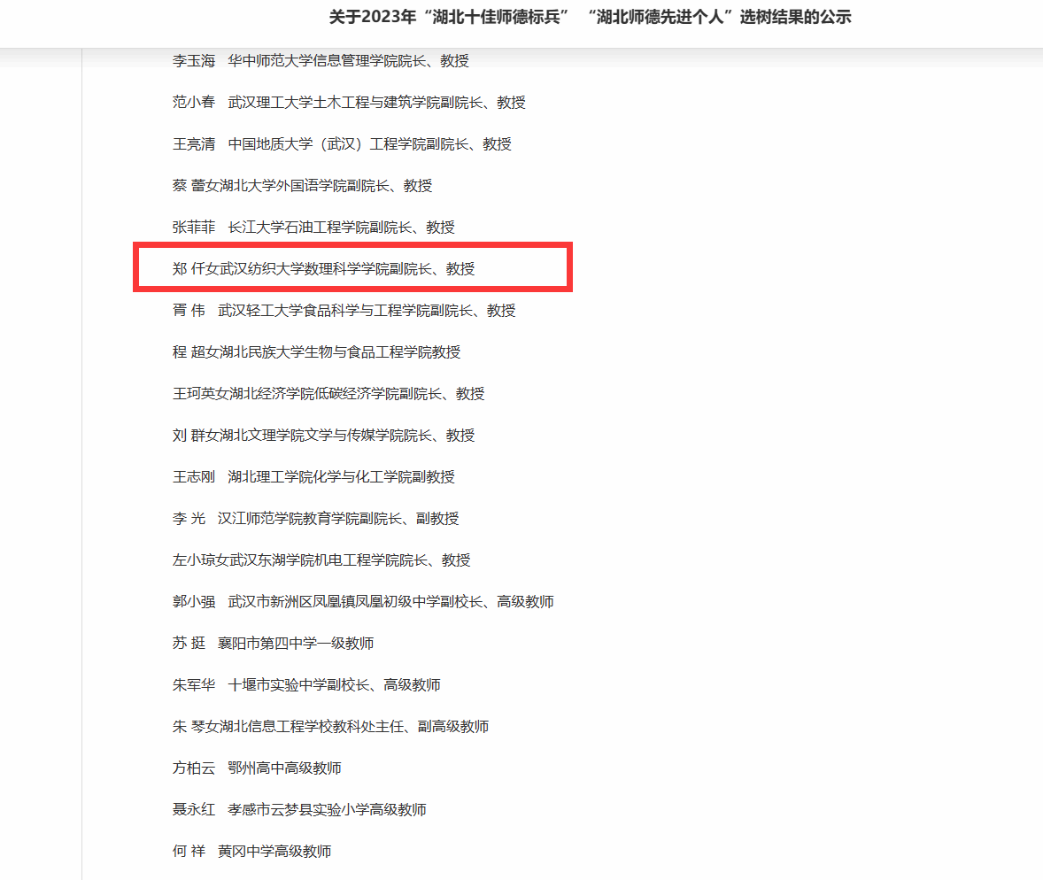 (郑仟教授获得湖北省师德先进个人)