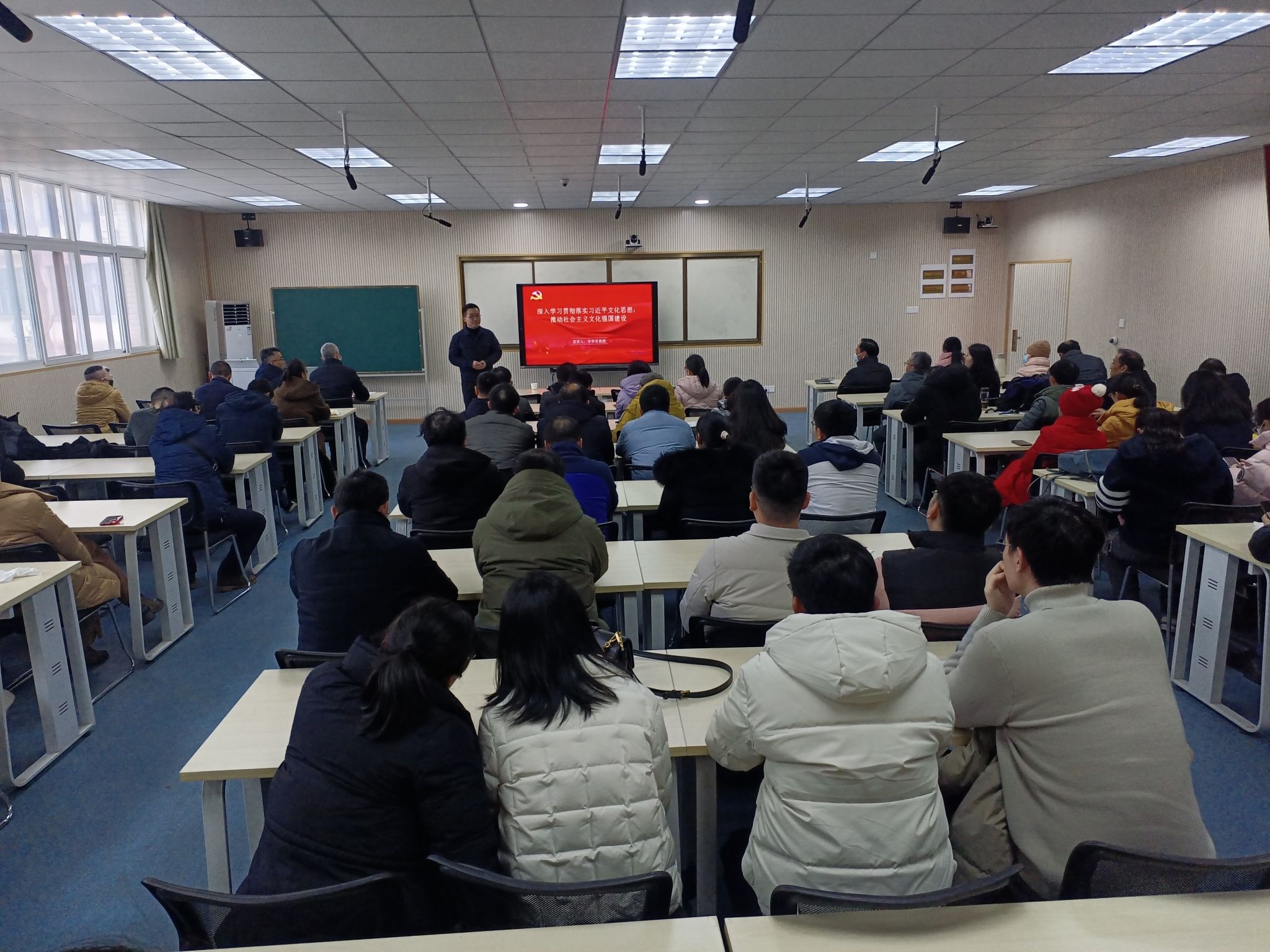 2月28日下午崇文楼205室,校党委常委李华君教授以《深入学习贯彻落实习近平文化思想:推动社会主义文化强国建设》为题,给WilliamHill体育全体教职工带来了一场精彩的学术报告,学院党委书记段溢波主持了学术报告会。