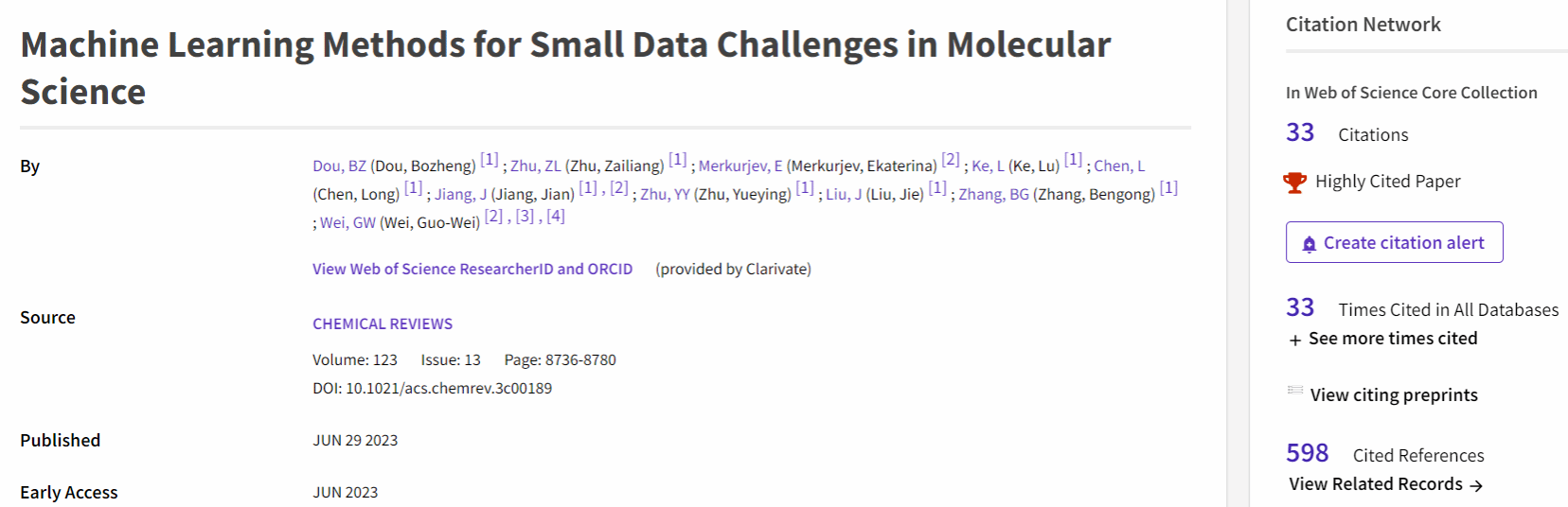 最近,根据Essential Science Indicators(简称ESI)更新数据显示,我校WilliamHill体育江健教授为第一通讯作者,其研究生窦博正为第一作者并以我校为第一单位在化学领域顶级期刊《Chemical Reviews》(影响因子62.1)上发表的论文“Machine Learning Methods for Small Data Challenges in Molecular Science”(Chem. Rev. 2023, 123, 8736−8780)成功入选化学学科领域全球前1%ESI高被引论文。该论文也是我校历史上影响因子最高的期刊论文。