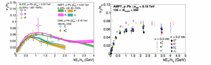 研究高能重离子碰撞,探索夸克物质的形成与性质,不仅有助于深入理解强相互作用这一自然界基本作用力,还能为揭示宇宙物质起源问题提供关键的线索。美国布鲁克海文国家实验室上运行的相对论重离子对撞实验和欧洲LHC上的大型重离子对撞实验,在大、小碰撞系统下均观测到了末态粒子具有显著的集体流效应,但对这些现象的理论解释仍有争议。汤思宇博士及其合作者利用多相输运模型(AMPT),通过优化轻、重味夸克产生概率,改进部分子演化过程,并且耦合多种强子化机制,成功地描述了LHC上质子-铅核碰撞中所观测到的鉴别粒子椭圆流,并对其组分夸克标度行为进行了细致研究。这表明了除流体动力学理论与初态胶子饱和理论外,基于非平衡物理的输运理论也是回答小系统碰撞中集体流起源问题的重要解释之一。
