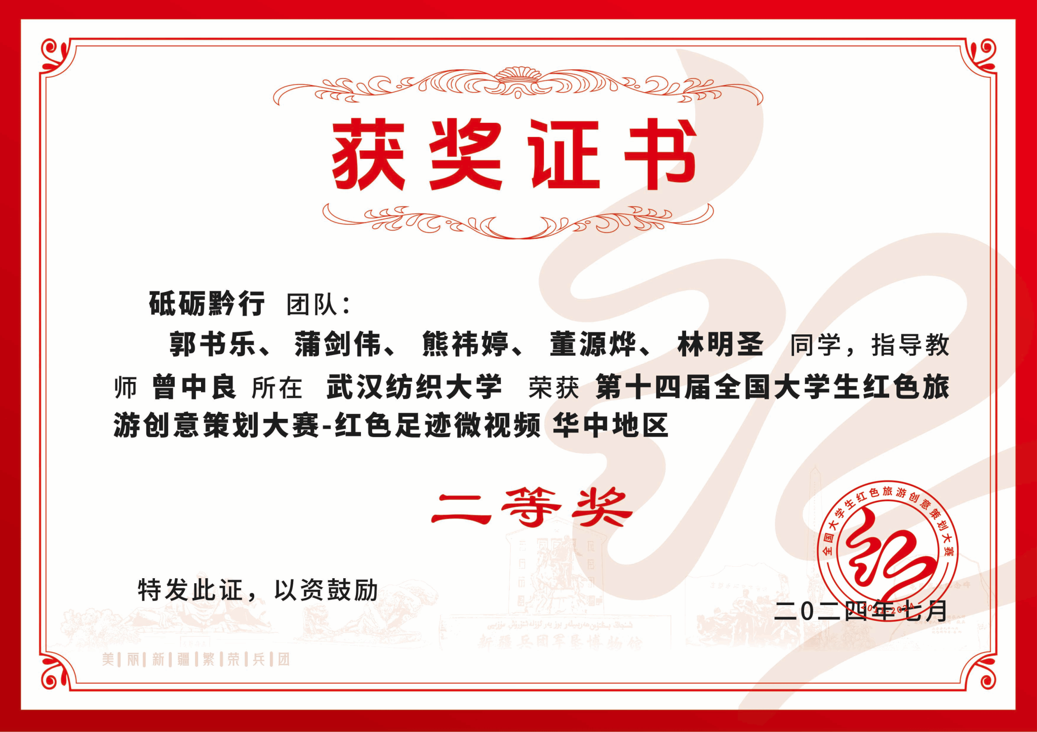 近日,由文化和旅游部资源开发司、国家发展和改革委员会社会发展司、共青团中央宣传部、新疆生产建设兵团文化体育广电和旅游局、新疆生产建设兵团第八师石河子市人民政府、北京第二外国语学院共同主办,中国旅游协会旅游教育分会等单位承办的第十四届全国大学生红色旅游创意策划大赛已落下帷幕。本届大赛自4月份启动,吸引了全国1119所高校、6739支队伍、2.7万名师生参加,参赛作品5857项。我校“砥砺黔行”团队在众多作品中脱颖而出,荣获“红色足迹微视频”赛道华中赛区二等奖。