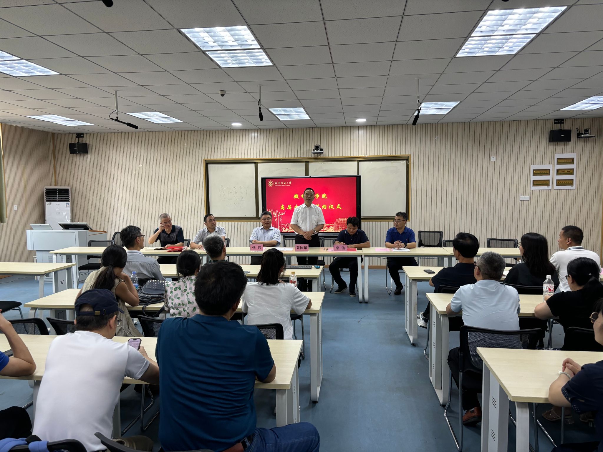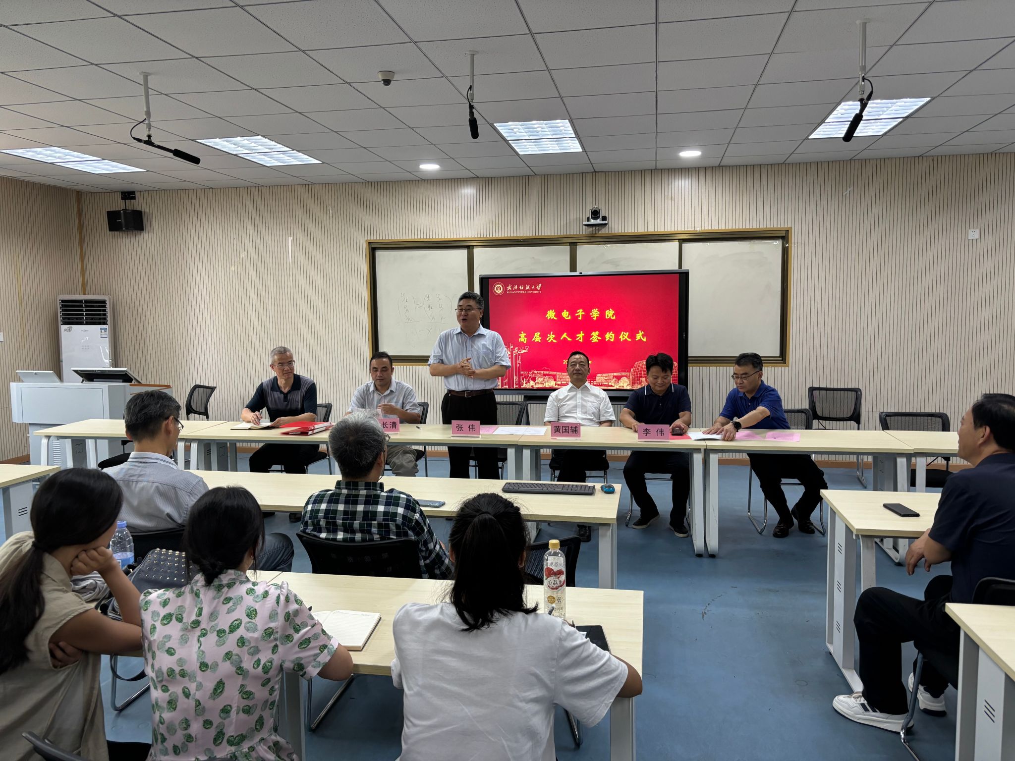张伟博士进行了表态发言:非常感谢学校领导的关心与信任,今后将在学校、学院的坚强领导下,加倍投入时间和精力,在产教融合、科教融汇等方面发挥自己的作用,为微电子学科的建设发展作出应有的贡献。