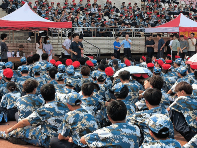 段书记与同学们亲切交谈,询问大家的身体状况和军训感受,表达了对大一新生的中秋祝福,对同学们在烈日下坚持训练、不畏艰苦的精神表达了赞扬。汪院长肯定了同学们在军训中的优异表现,表达了对大一新生的期待和鼓励,叮嘱同学们注意防暑降温,保持健康的生活习惯。