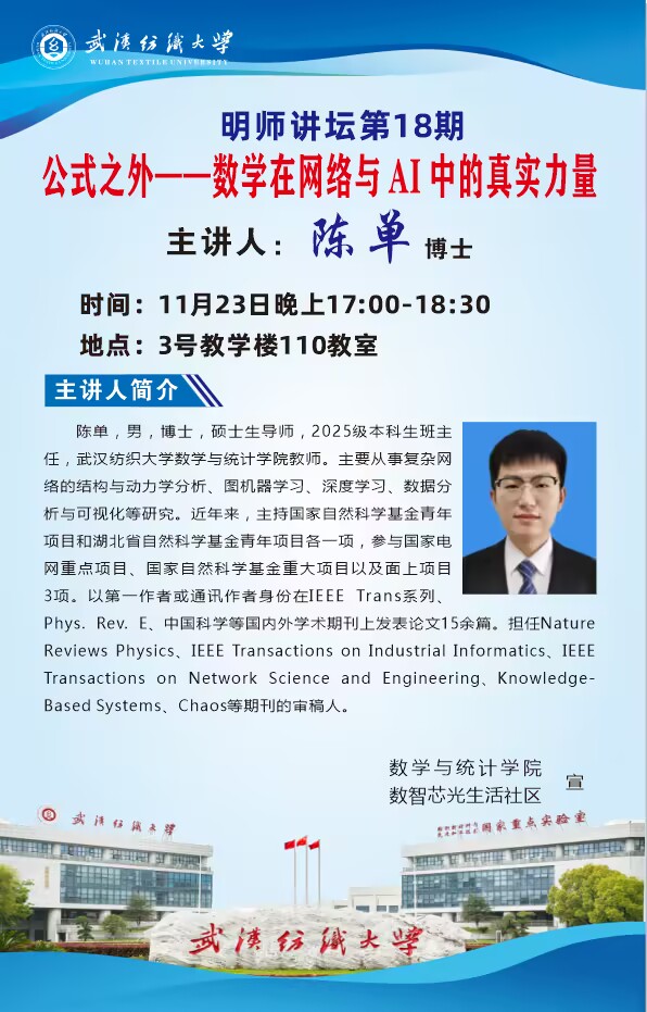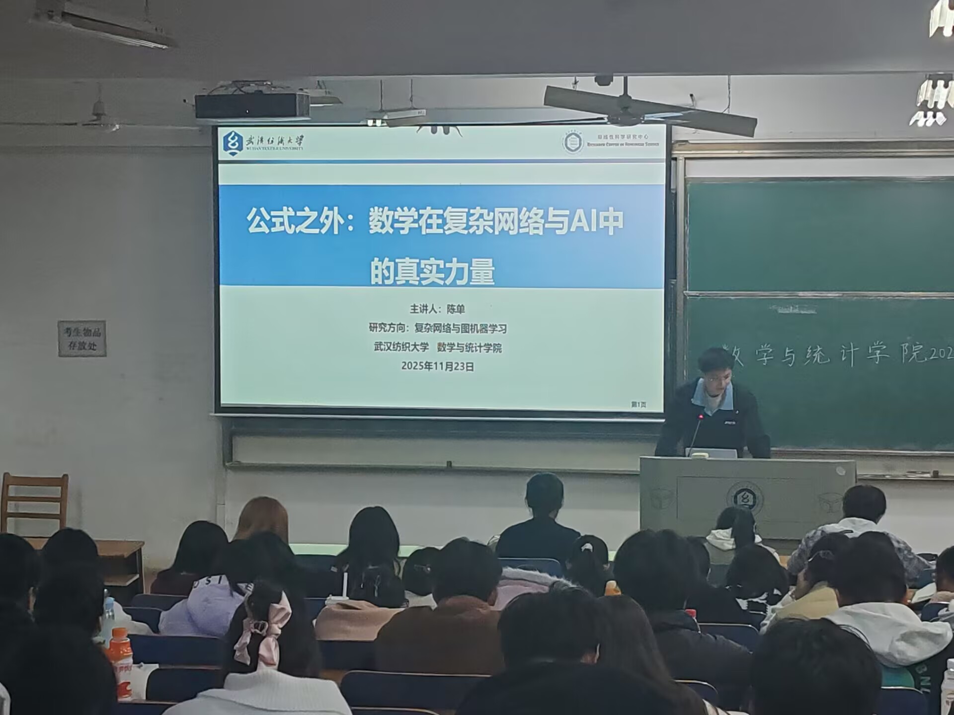 2025年11月23日,WilliamHill体育WilliamHill体育陈单博士以“公式之外:数学在复杂网络与AI中的真实力量”为题开展专题分享,深入剖析数学作为隐藏引擎,在复杂系统认知与人工智能发展中的关键作用,为在场听众揭开数学跨界应用的神秘面纱。