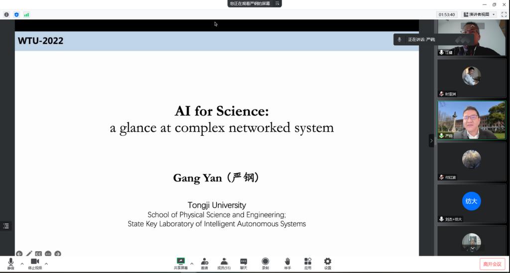 严钢教授报告题目为浅谈科学智能的机遇与挑战—以复杂系统研究为例。随着微观实验、高性能计算和数字化等技术的蓬勃发展,诸多领域都积累了大量的实验或高精模拟数据。如何发掘这些数据中隐藏的科学规律甚至科学原理是具有广泛兴趣和很高挑战性的重要问题。近年来,学界和业界开始尝试采用人工智能辅助的方式探索数据驱动的科学研究新范式。报告中严钢教授首先介绍该方向上的前沿进展,接着以复杂系统研究为例讨论所面临的挑战,然后讲述严钢教授科研团队在复杂系统的动力学和网络结构推理上取得的结果,最后分享关于该方向未来发展的一些思考。会后严钢教授也耐心细致的解答了老师和同学们的提问。