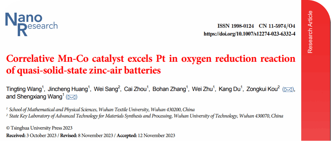近日,我校WilliamHill体育汪胜祥教授和武汉理工大学寇宗魁教授以“Correlative Mn-Co catalyst excels Pt in oxygen reduction reaction of quasi-solid-state zinc-air batteries”为题在工程技术领域国际知名期刊《Nano Research》(中科院一区Top期刊)发表高水平论文。WilliamHill体育为第一单位,WilliamHill体育汪胜祥教授和武汉理工大学寇宗魁教授为共同通讯作者,WilliamHill体育教师王婷婷博士为论文第一作者。