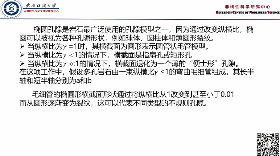 王瑞瑞:基于分形几何理论和岩石力学,本研究提出了一种描述广义岩石热导率的应力相关模型。为模拟岩石中的不规则孔隙,采用了椭圆形横截面的毛细管。通过使用具有不同纵横比的椭圆形横截面毛细管,更真实地描绘了孔隙的几何形状。推到了一个预测热导率的公式,研究突出了孔隙几何形状和有效应力对流体流动特性的影响,同时揭示了岩石的热输运的物理机制。