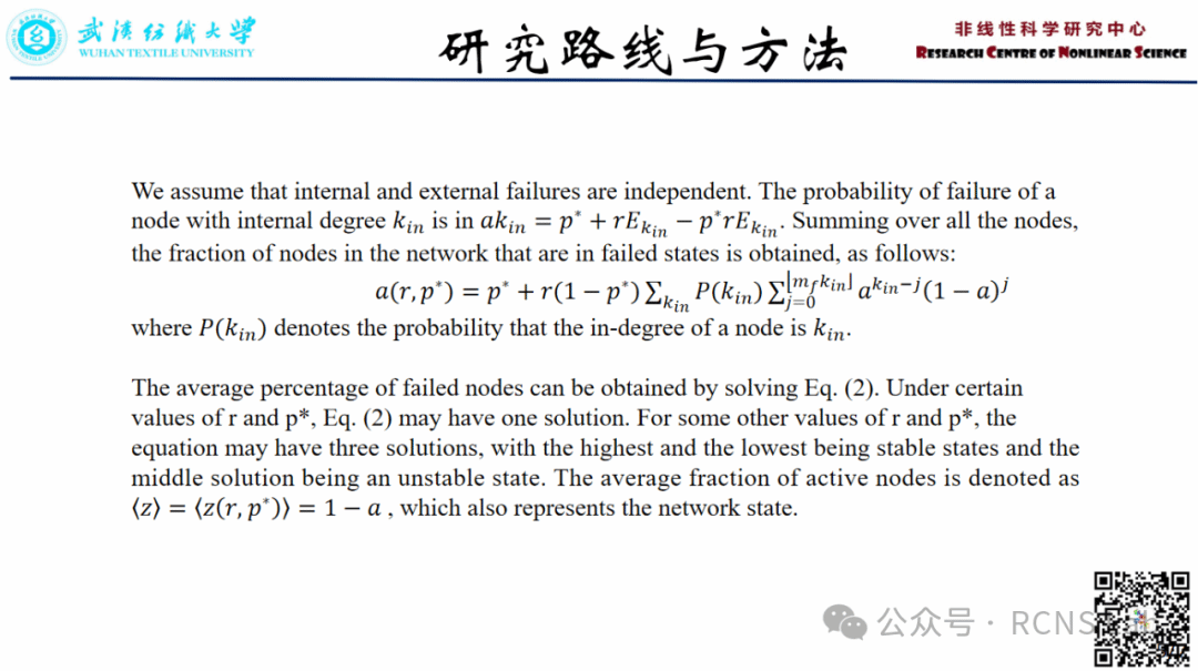 汪玉婷 :本次汇报了一篇文献《Spontaneous Recovery in Directed Dynamical Networks》。以往关于动态网络自发恢复的研究仅限于无向网络。然而,大多数现实世界的网络都是定向的。为了填补这一空白,我们建立了一个节点可能交替失效和恢复的模型,并开发了一个理论工具来分析有向动态网络的恢复特性。我们发现,该工具可以准确地预测活动节点的最终比例,并且预测精度随着网络中双向链路比例的增加而降低,这强调了方向性在网络动力学中的重要性。有向动态网络由于初始状态不同,在相同的控制参数下可能呈现出交替的稳定状态,表现出迟滞行为。此外,对于有限大小的网络,活动节点的比例可能在高状态和低状态之间来回跳跃,模拟重复的故障恢复过程。这些发现有助于阐明系统恢复机制,并有助于更好地设计具有高弹性的网络系统。