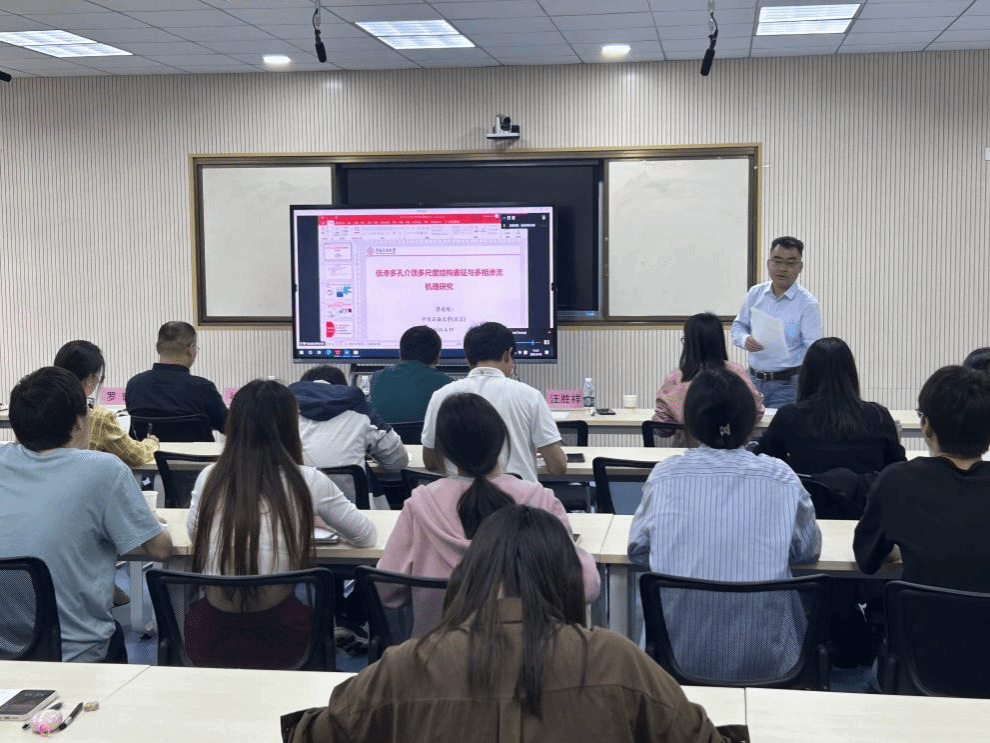 徐鹏教授做了题为“多尺度多孔介质传热传递的细观分形理论和模型研究”报告。他首先从分形理论、分形表征、分形重构三个方面对多尺度多孔介质的微细结构进行精细表征,接着从渗流、传热、扩散、电渗四个方面详细介绍了微纳尺度多孔介质的热质传递的机理与特性,最后通过射流干化、污泥脱水、煤层气三方面的应用介绍了多孔介质的跨尺度输运及多场耦合特性。
