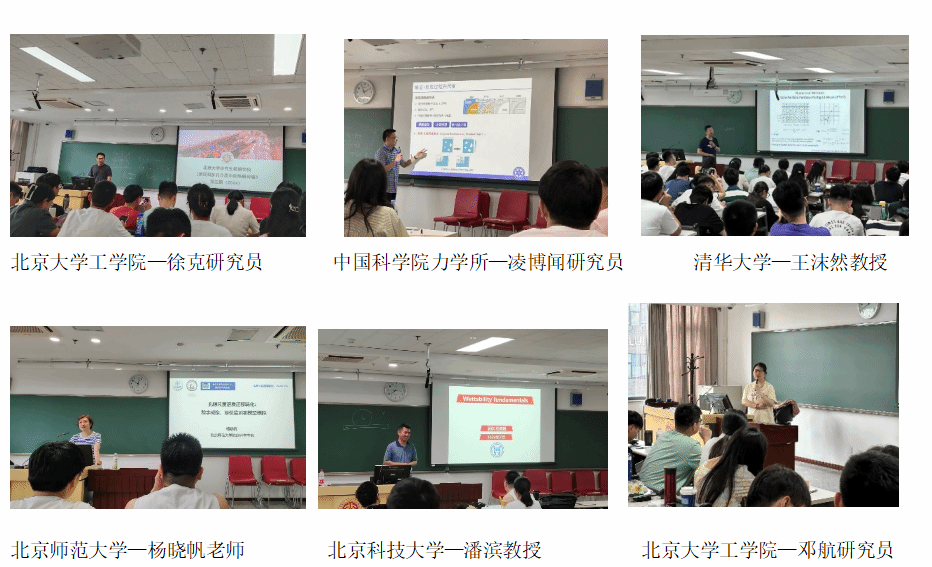 在这次暑期学校期间,北京大学工学院能源与资源工程系的徐克研究员详细介绍了渗流与多孔介质的基础,讲授了多相渗流热力学和不稳定性;中国科学院力学研究所的凌博闻研究员讲解了渗流物理思想、建模基础以及升尺度方法;清华大学的王沫然教授分享了多孔介质微观结构表征及渗透率测量的新方法;北京师范大学的杨晓帆教授介绍了多孔介质中的反应溶质运移;北京科技大学的潘滨副教授探讨了润湿性和渗吸基础与表征,并展示了利用电润湿调控多孔介质润湿性的技术;北京大学的邓航研究员则讲述了裂隙体系中的反应溶质运移。通过上述课程的学习,同学们对渗流相关领域有了较深的认识和理解,提高了自主学习的能动性和自觉性。
