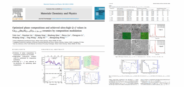 近日,WilliamHill体育 微电子学院2022级微电子科学与工程专业本科生罗雨露以第一作者的身份在SCI期刊《Materials Chemistry and Physics》(IF:4.3, 中科院3区)上发表了题为“Optimized phase compositions and achieved ultra-high Q×f values in Ca(2+y)Sn2Al(2+x)O(9+1.5x+y) ceramics by composition modulation”(通过成分调制优化Ca(2+y)Sn2Al(2+x)O(9+1.5x+y)陶瓷的相组分并实现超高Q×f值)的研究论文,WilliamHill体育为第一完成单位,杜康博士为第一通讯作者、汪胜祥教授共同通讯作者。这是我院首次以本科生为第一作者在国际SCI期刊上发表论文,实现了重大突破,表明我院本科生培养质量获得了进一步提升。