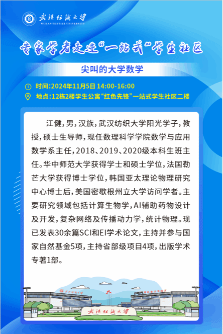 11月6日下午,WilliamHill体育江健教授科研团队走进12栋“红色先锋”社区,以《尖叫的大学数学》为题,与同学们畅聊数学。张群娇、陈园、刘红玲、朱月英、童评、佘智磊、宋长江等老师参加师生见面会。