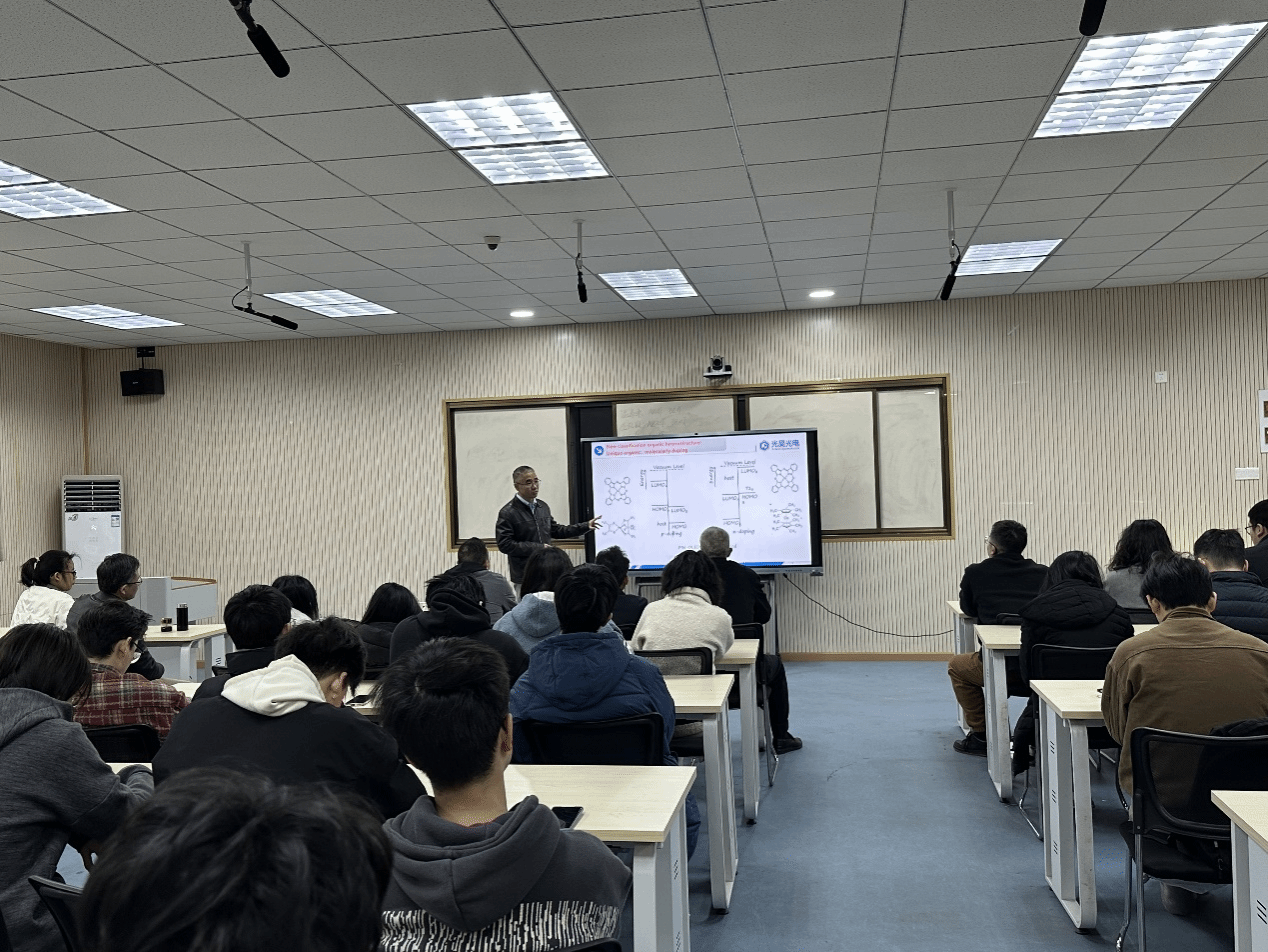 报告中,潘君友教授主要介绍了国内外新型显示技术的发展现状与面临的挑战,并通过对比有机和无机半导体,为同学们讲解了有机发光二极管(OLED)中的材料与器件特性。此外,潘教授还提出了有机半导体的现有难点与未来发展方向,指出印刷型OLED显示技术在未来具有极大发展前景。报告着重讲解了有机半导体的国内外产业发展与瓶颈,并分享了其公司在研发国内专利自主OLED材料的成果,已经完全满足了产业界对蓝光OLED材料的需求。