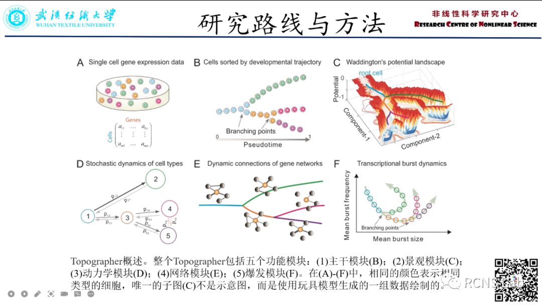 韩长锋:本文开发了一种多功能的新方法,Topographer--以构建"定量"Waddington的单细胞转录组学数据景观。Topographer能够识别复杂的细胞状态转移轨迹,并估计以命运和转移概率为特征的复杂细胞类型动力学。它还推断了标记基因网络及其动态变化以及沿细胞状态过渡轨迹的转录爆发的动态特征。将这种方法应用于原代人成肌细胞分化的单细胞RNA-seq数据,本文不仅鉴定了三种已知的细胞类型,还估计了它们的命运概率和它们之间的转移概率。
