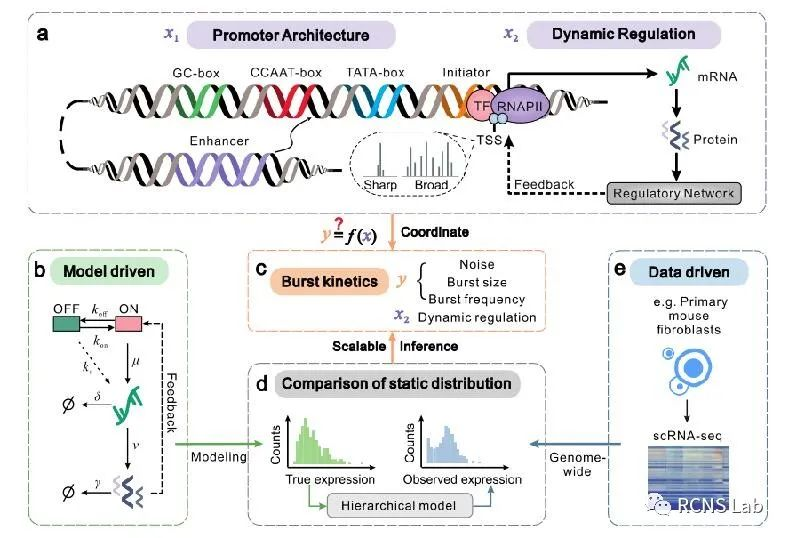 王梦园:本次组会汇报了一篇名为《Genome-wide inference reveals that feedback regulations constrain promoter-dependent transcriptional burst kinetics》的文献,该文章开发了一个基于模型驱动和数据驱动组合的统计框架,以执行可扩展的全基因组推断。该框架使用scRNA-seq数据的静态快照来推断转录爆发动力学背后的调控机制。具体地说,它整合了关于基因表达噪声、爆发频率、爆发大小和反馈调节形式的预期信息。